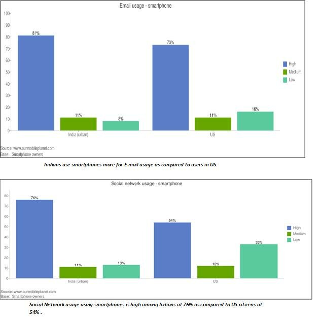 According to a survey measuring India’s smartphone impact, done by Google with IPSOS and the MMA (Mobile Marketing Association), Indians have outnumbered US in usage of smartphone for social networking and emails. The survey findings state that 76 per cent Indians are accessing social networking sites more through their smart phones in comparison to a 54 per cent from the US. Email usage on smartphones is higher in India upto 81 per cent when compared with the US.