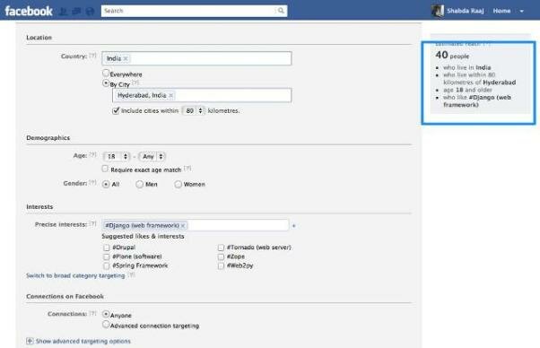 FB allows you to segment your audience by country, city, age, gender, relationship status, interests and more. Let's say I was looking to hire people for my company. We work with Django and Python technologies. We are based in Hyderabad. So if we segment our ad to city = Hyderabad and Interest is Django or Python, we get 400 people. This is as highly targeted list as you get, not available in any other channel. Even with such accurate targeting your CPC is about 10-15 cents. (However if you segment too narrowly, FB may sometimes reject your ad.)