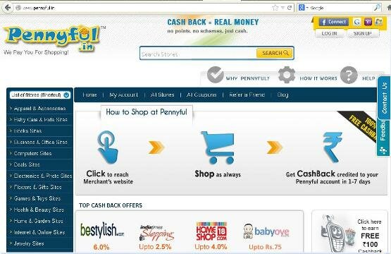 Bangalore based online cashback portal, Pennyful.in allows users to make the desired purchases by directing them to the retailer's site and availing the cashback offer. The perk is over and above the ongoing discounts and coupon deals. The cash reward is credited to the customer's account when the minimum redeemable limit of Rs 150 is reached. The money can be wired to his bank account or delivered through cheque.