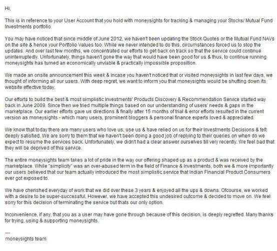 “While we never intended to do this, circumstances forced us to stop the updates. And over last few months, we concentrated our efforts to get back on track so that the service could continue uninterruptedly. Unfortunately, things haven't gone the way that would have been good for us & thus, to continue running MoneySights has turned an economically unviable and practically impossible proposition,” the company said.